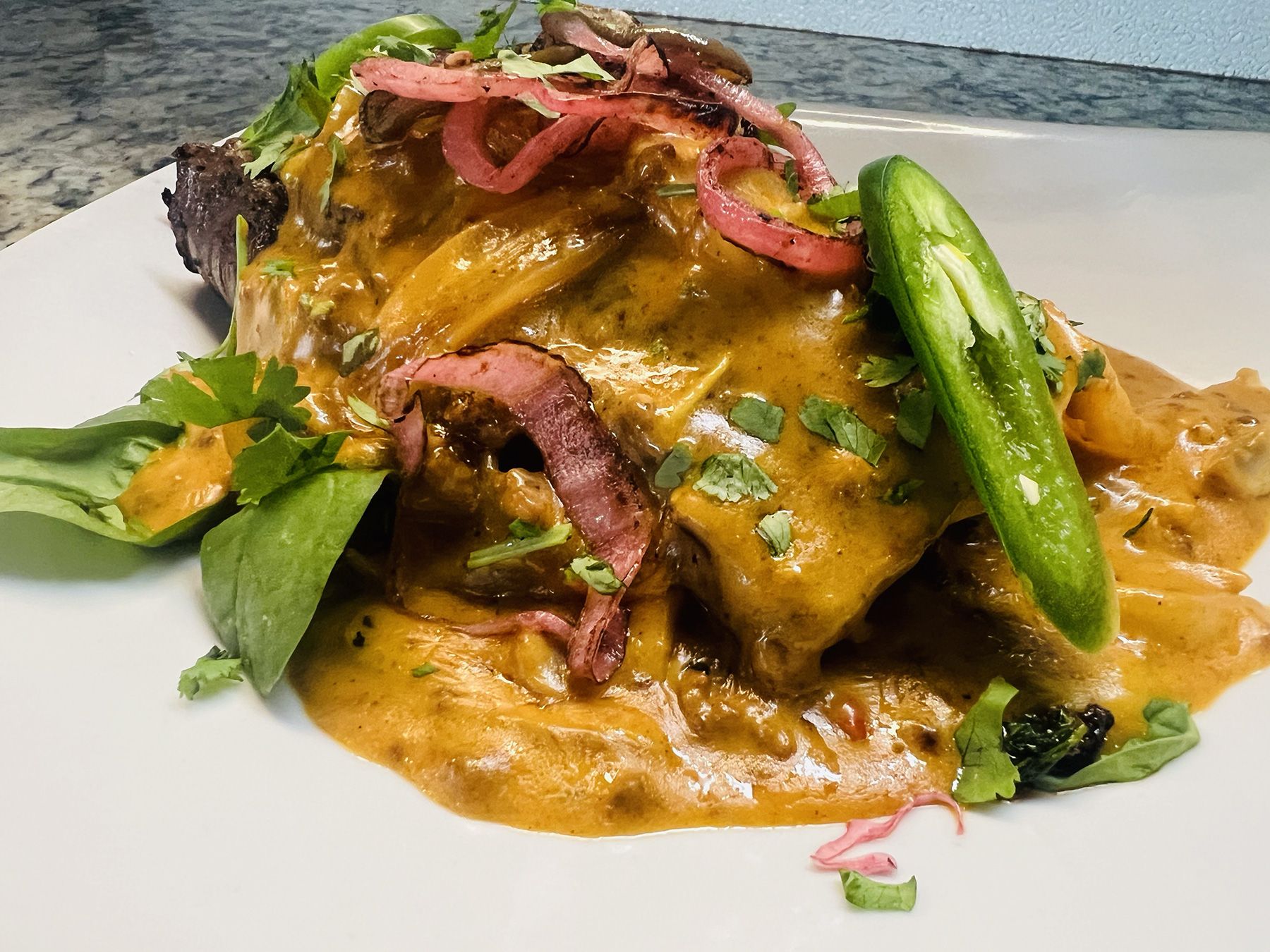 Brisket marinated in adobo, chili, herbs and spices, and drizzled with enchilada salsa, Queso Fresco, and topped with avocado slices